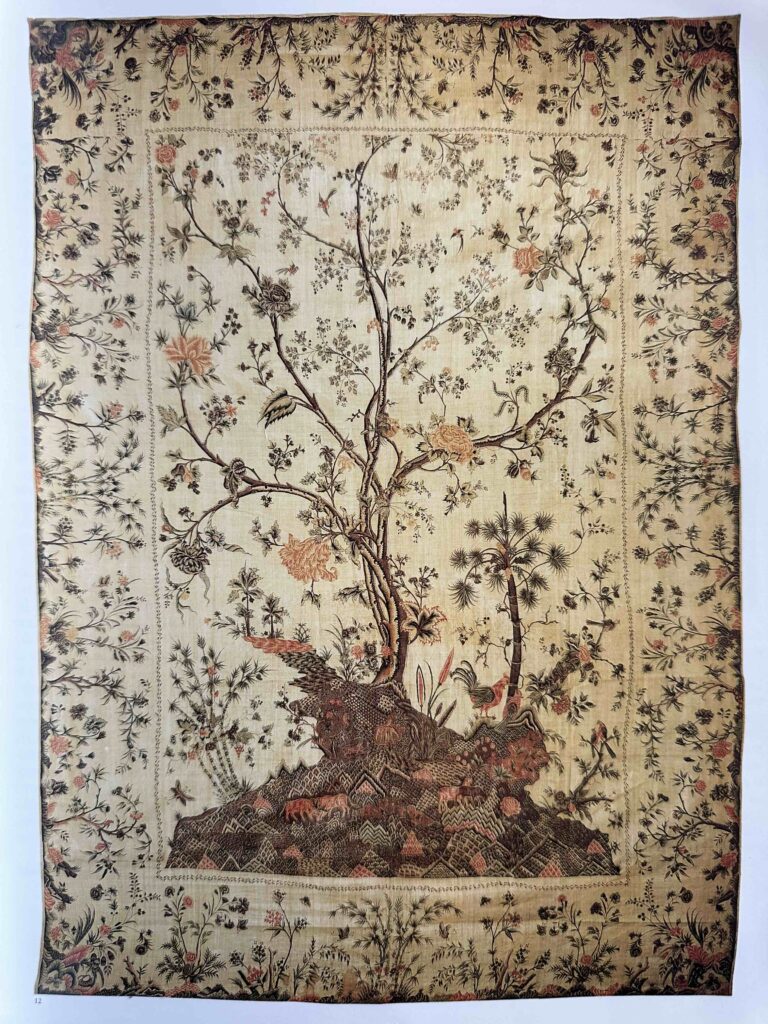 Il caso, il fato ( se preferite il destino, la Provvidenza..) crea spesso sinergie sublimi. Possiamo in questo senso dire che i Mezzeri Genovesi, simbolo di appartenenza e identità della Superba, sono in realtà figli di appartenenze ed identità lontanissime, sono figli degli antichi Palamponi prodotti in India. Il palampore è un tessuto decorato a mano proveniente da quelle remote regioni, realizzato per il mercato estero nel XVII e XVIII secolo, specialmente per l’Europa. Il nome deriva dalla parola hindi palangposh, che significa “coperta” o “copriletto”. Questi tessuti di cotone dipinti e tinti erano popolari come coperte da letto e drappeggi murali, e sono spesso caratterizzati dal motivo dell’albero della vita, con una ricca decorazione di fiori e uccelli. In realtà a loro volta vennero originati da tessili più antichi, caratterizzati da un forte valore simbolico. E’ interessante approfondire il fatto che la più tipica raffigurazione sia l’Albero della Vita, normalmente affiancato da due uccelli definiti “guardiani che si fronteggiano; l’Albero della Vita, Axis Mundi, è noto fin dal IV Millennio a.C. . Appartiene a quel poderoso complesso di riti, simboli e miti anche conosciuto come “ simbolismo del Centro” (1) che lega l’Albero Cosmico ai culti della Grande Madre Terra: sia la donna sia l’albero danno frutti, generano vita, e tutto ruota attorno alla loro centralità. Nella tradizione Cristiana è al centro del Paradiso Terreste, al principio del tempo, unisce l’ Alfa all’ Omega . Gli uccelli possono invece rappresentare sia le anime di defunti che ascendono o discendono ai vari livelli cosmici, o la dualità nell’anima individuale contrapposta allo spirito universale o coscienza pura . (2, pag. 20) . Un simbolo familiare, punto istintivo di contatto tra Oriente ed Occidente. E l’ennesimo esempio della evidenza archetipale e metaforica dell’immagine, che si fa narrazione esistenziale , riconoscibile in ogni tempo e in ogni luogo, nei Palamponi Indiani come nei Mezzeri Genovesi.